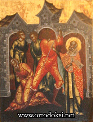 - Oi pyhä, sinä olit Myrrassa | oikeana pyhän palveluksen toimittajana | sillä täyttäen Kristuksen evankeliumin käskyt | sinä, oi pyhittäjäisä, panit henkesi alttiiksi kansasi edestä | ja pelastit viattomat kuolemasta. | Sen tähden sinä tulitkin pyhitetyksi || Jumalan armon salaisuuksien suurena palvelijana.