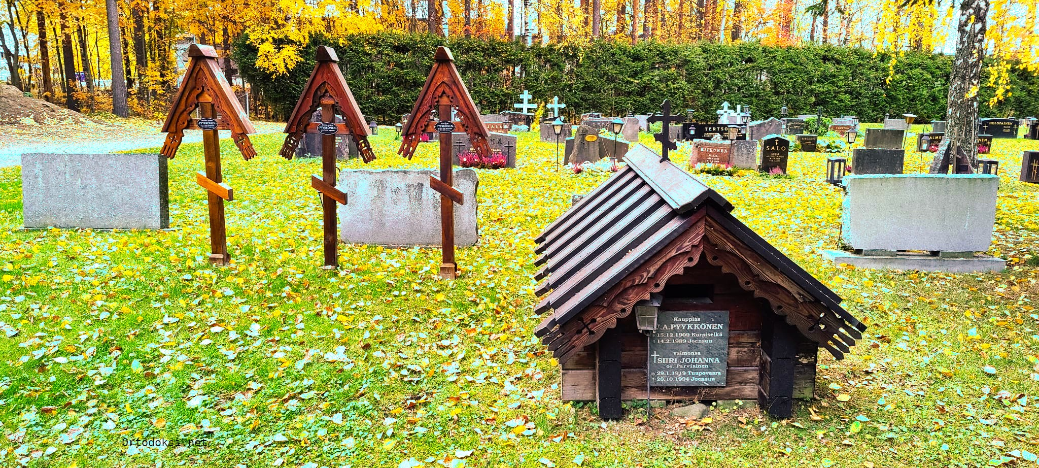 Ortodoksisia hautamuistomerkkejä Joensuun ortodoksisella hautausmaalla (kuva © Ortodoksi.net / Hannu Pyykkönen)