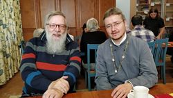 Isä Mikael Sundkvist (oik.) liturgian jälkeisessä kahvitilaisuudessa Vantaan Tikkurilassa kesällä 2017 yhdessä yhden Ortodoksi.netin ylläpitäjän (vas.) kanssa.