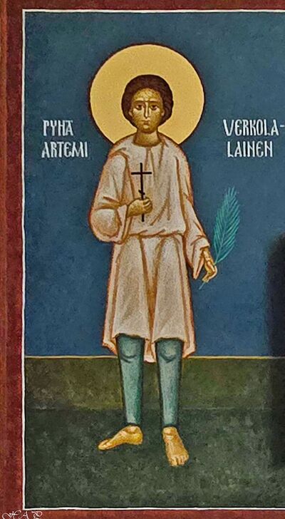 [[Karjalan valistajat|Karjalan valistajiin]] luettu lapsipyhä '''Artemi Verkolalainen''' syntyi Pinegajoen varrella Verkolan kylässä Vienanmeren alueella vuonna 1532 hurskaaseen ja Jumalaa kunnioittavaan talonpoikaiskotiin. Lapsesta kasvoi perheelle ja Jumalalle kuuliainen lapsi, joka kaikin tavoin yritti auttaa kotona erilaisissa töissä ja monella tavoin jo lapsena osoitti sävyisyyttä ja Jumalan pelkoa sekä kuuliaisuutta vanhemmilleen. |